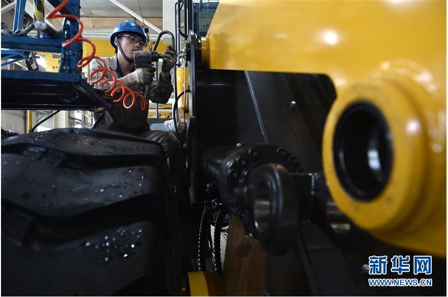 在山东凯发(中国)官网工程机械有限公司,工人在装载机生产线作业
